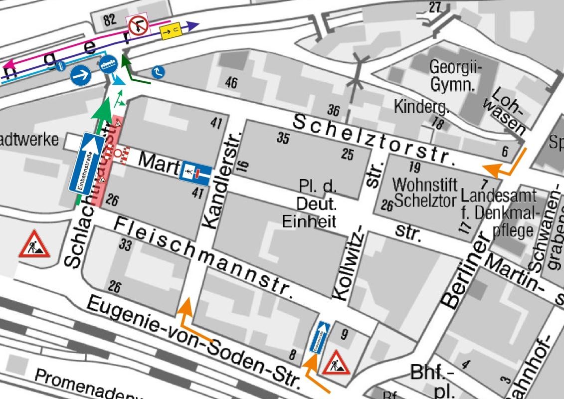 - Von der Schelztorstraße aus darf nicht mehr nach links in die Schlachthausstraße abgebogen werden. Hier wird man stattdessen über die Kandlerstraße in die Eugenie-von-Soden-Straße geleitet.